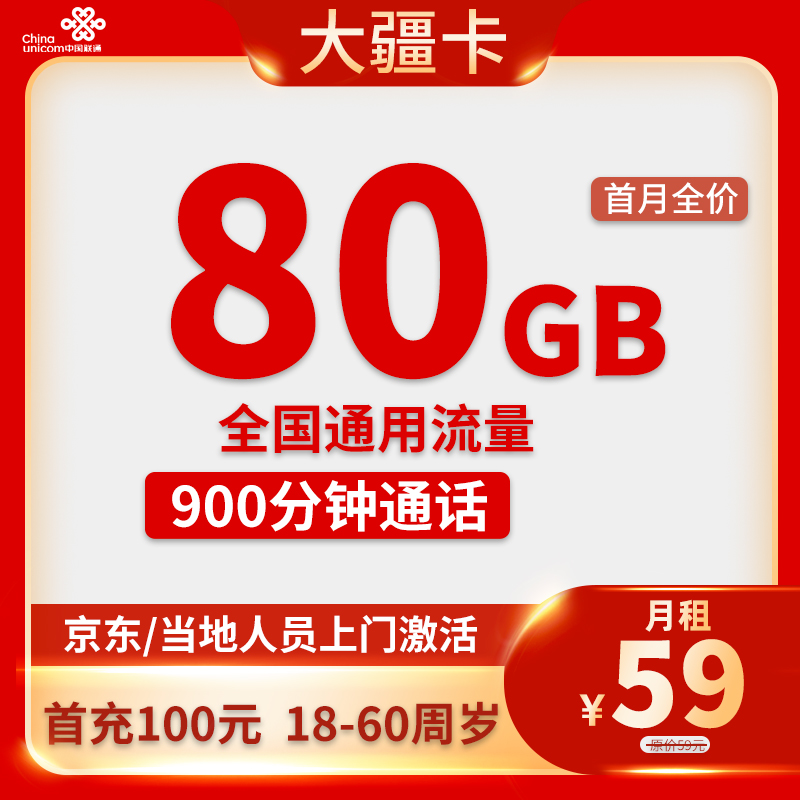 59元80GB通用流量+900分钟通话【只发新疆省内】